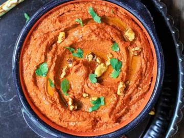 A rich and spicy dip made from red peppers, walnuts, garlic, and pomegranate molasses.