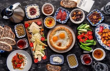 Enjoy a traditional Turkish breakfast spread featuring an array of delightful items. Perfect for a leisurely morning meal with friends and family.