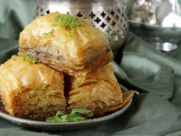 An award-winning, unique pastry made with thin layers of phyllo dough filled with nuts and sweetened with a luscious sherbet, offering an unmatched, crispy delight.
