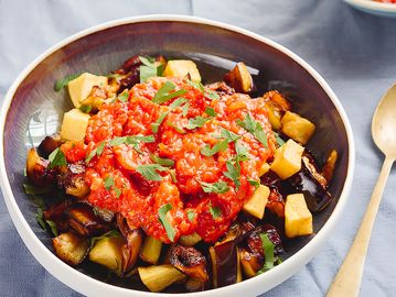 Fried eggplant and bell peppers cooked in a rich and tangy tomato sauce.