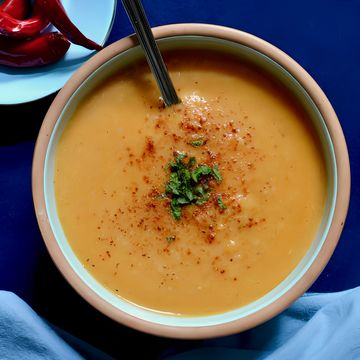 A hearty soup made with red lentils, onions, carrots, and potatoes, served with lemon.